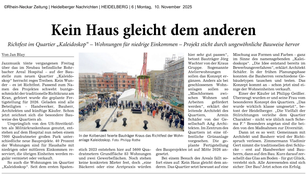 Am vergangenen Freitag wurde auf dem Rohrbacher Hospital-Areal in Heidelberg das Richtfest des neuen Wohnquartiers „Kaleidoskop“ gefeiert. Unter Jazzmusik und mit traditionellem Richtkranz wurde der Baufortschritt gewürdigt – die Fertigstellung ist für Mitte 2026 geplant.