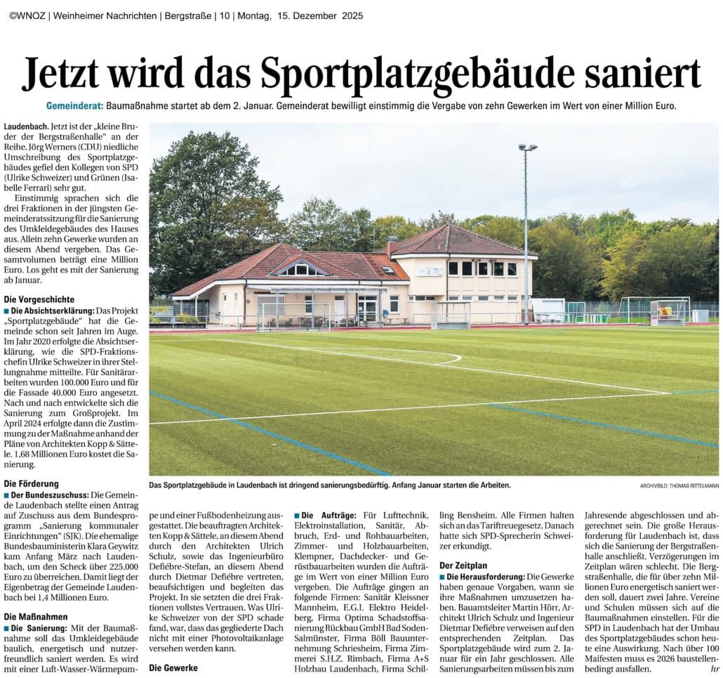 Ab 2. Januar 2026 wird das Sportplatzgebäude in Laudenbach umfassend saniert. Die Bauzeit ist auf zwölf Monate angesetzt, das Gebäude bleibt in diesem Zeitraum vollständig geschlossen.